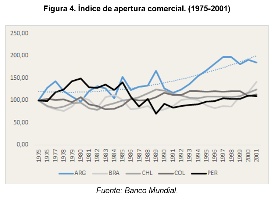 Comencemos por la apertura comercial. Es justo decir que la Argentina es un país menos abierto al comercio internacional que el resto de la quinterna. Sin embargo, vimos que esto no parecía ser un obstáculo para el crecimiento hasta 1974. ¿Qué sucede desde entonces? Artana se sorprenderá al observar que la Argentina fue el líder en crecimiento del grado de apertura comercial del ‘75 en adelante, sobre todo desde 1993.