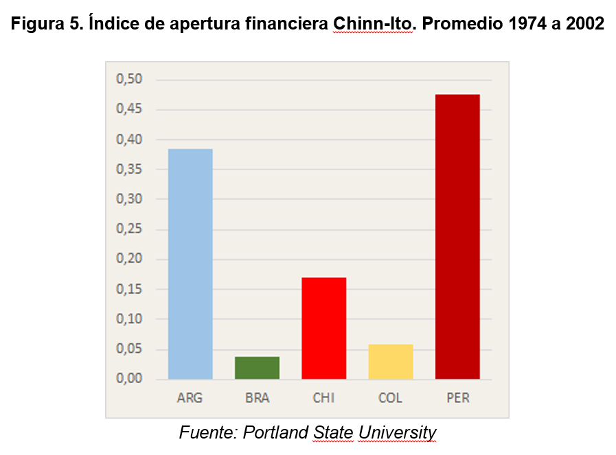 Un viejo caballo de batalla –o más bien, caballo de Troya– del neoliberalismo es la importancia de reglas de juego claras, y directamente asociado a ellas la libre movilidad de capitales. Esto es, en criollo, la menor existencia posible de cepos a la compra de moneda extranjera y otras restricciones a los movimientos financieros. Esto puede ser evaluado a través del Índice Chinn-Ito, que asume valor cero cuando la apertura financiera es menor (más “cepos”) y valor uno cuando la apertura financiera es mayor. En 1974 este indicador era cero para todos los países que estamos analizando (mínima apertura). Para la Argentina aumentó hasta el pico de 0,94 en 1997, justo antes de la crisis y el promedio entre los años comprendidos entre 1974 y 2002 fue de 0,38. Significativamente mayor apertura que Chile (0,17), Colombia (0,06) y Brasil (0,04). Sólo nos superó Perú con una apertura promedio ligeramente superior (0,48).