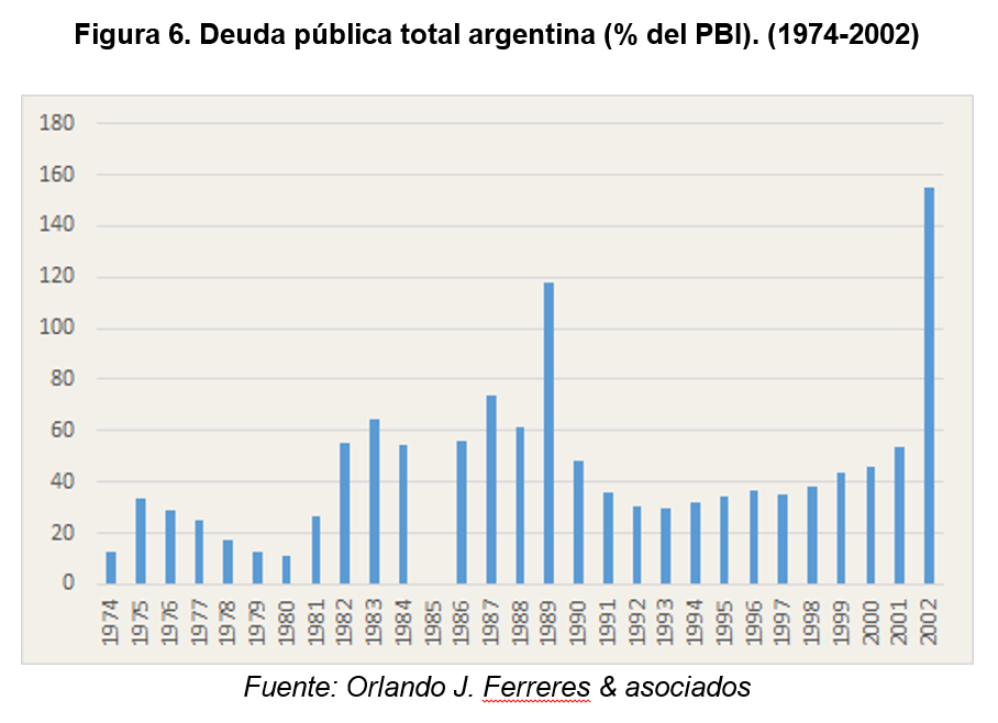 Artana menciona en su nota el triste desempeño crediticio de la Argentina, con recurrentes episodios de default. Conviene, por ende, estudiar el endeudamiento del período, causa primaria de cualquier incumplimiento. En 1974 la deuda pública consolidada representaba el 13% del PBI y no superaba el 30% desde 1940. En la Figura 6 observamos su desempeño desde entonces. Los crecimientoss exponenciales desde 1980 y desde 1993 fueron germen de los defaults de 1982, 1989 y 2002 (el mayor de la historia mundial).