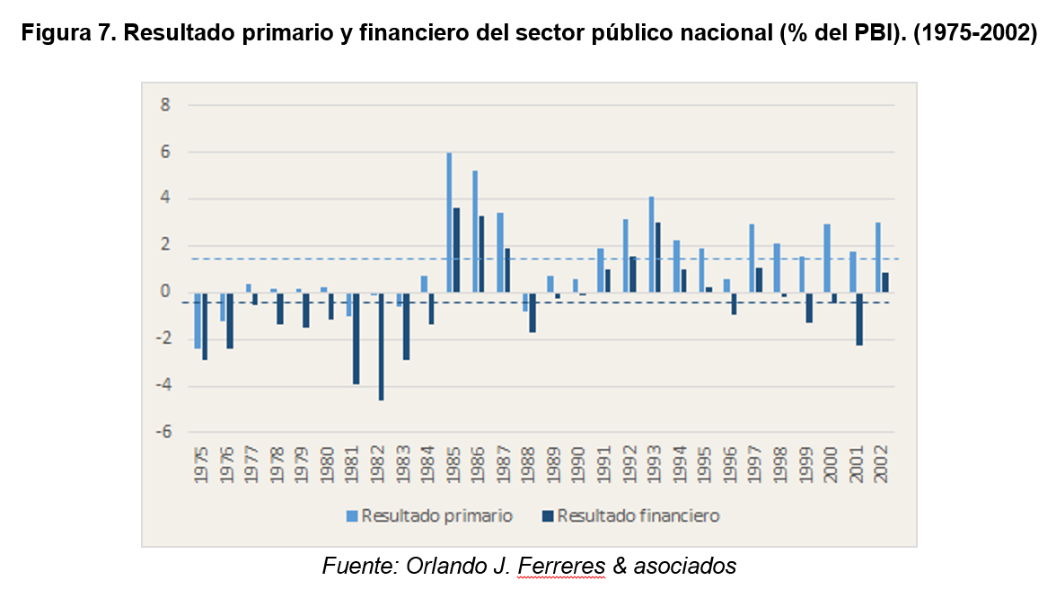 Descartando como causas probables de esta “corta decadencia” la apertura comercial y financiera y el riesgo crediticio, los talibanes del liberalismo deberán aferrarse a una última esperanza: el déficit fiscal, el gran tormento de nuestra patria, el origen de todos los males. Efectivamente, es un problema crónico de nuestro país. Sin embargo, sucede algo curioso: precisamente entre 1975 y 2002 existió mayoritariamente superávit primario (promedio 0,2 del PBI), pero al sumar la creciente carga de intereses producto del endeudamiento, el mismo se transforma en déficit para la mayoría de estos años (promedio -2,5).