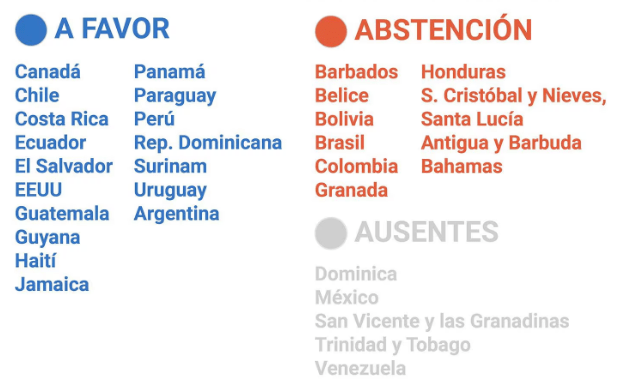 Varios de los países que votaron a favor de la resolución se resistieron a retirar la frase "como lo han solicitado los actores políticos venezolanos relevantes". Así, once países –que no compartían la inclusión de esa frase– se abstuvieron y cinco no estuvieron presentes. La aprobaron 17 países, pero les faltó un voto para lograr el consenso.