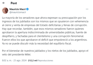 Si todos los diputados y los senadores Procaces acataran la opinión del ex Presidente, el veto de Milei sería exitoso, porque no se repetirían los 2/3 de la primera votación. Pero dados los conflictos internos, que también comprenden a la menguada tropa libertaria, es mejor no arriesgar hipótesis. El primer pronunciamiento sobre el tuit de Macrì fue del presidente del bloque, el cordobés Luis Juez, quien hizo saber que reiterará su voto en general a favor de los jubilados. Pero no reveló cómo lo haría en particular en los tres artículos críticos. Otros también manifestaron indignación ante el doble juego de Macrì.