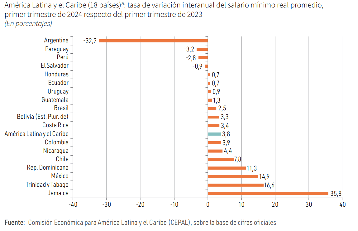 Cualquiera sea la fuente, oficial o privada, nacional o internacional, el cuadro es deprimente, con todas las variables en coma profundo. La Comisión Económica para América Latina de las Naciones Unidas (CEPAL) acaba de difundir un informe impactante, sobre deuda pública y salarios. Entre el primer trimestre de 2023 y de 2024, el salario mínimo real promedio disminuyó más de 32 puntos.