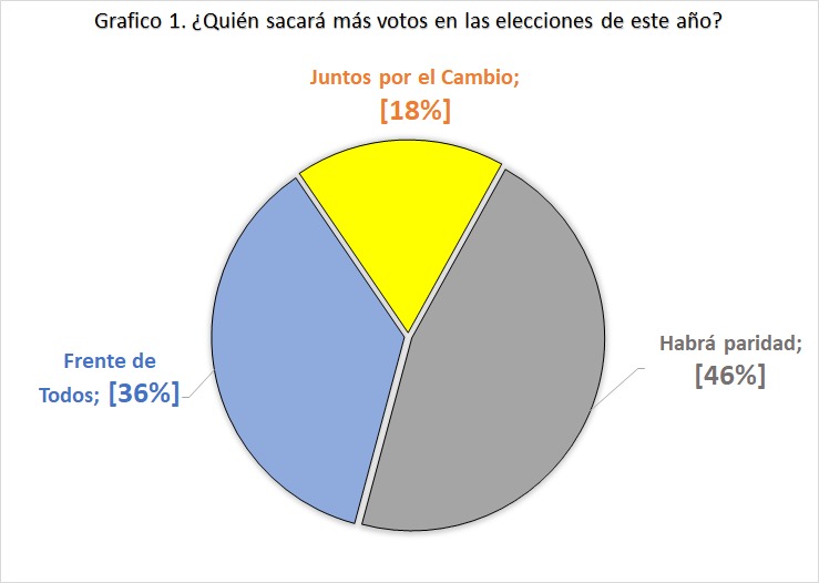 En una reciente encuesta realizada a porteños/as y bonaerenses se preguntó quién cree que sacará más votos en todo el país en las elecciones legislativas de este año. Entre las tres opciones que se brindaron, un 46% sostuvo que habrá paridad o empate, un 36% que ganarán los/as candidatos/as del Frente de Todos y un 18% que se impondrán los/as de Juntos por el Cambio, como se ve en el gráfico 1.