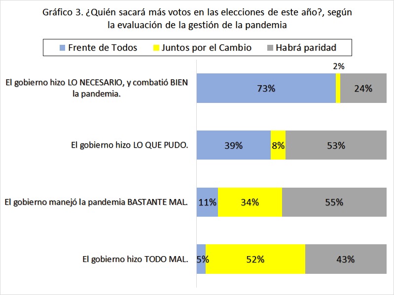 Por otro lado, cabría la posibilidad de que en las estimaciones de los próximos resultados electorales estuviese incidiendo más la evaluación de la gestión de la pandemia por parte del gobierno nacional. Por ejemplo, podría ocurrir que quienes piensan que el gobierno se ha manejado mal frente al Covid-19 estimen que la ciudadanía lo va a castigar en la próxima elección.