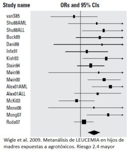El panorama se empezaba a esclarecer ya que es fuertísimo el vínculo entre exposición a agrotóxicos en la madre y leucemia en los hijos, incluso en revisiones de “medicina basada en la evidencia” como el metanálisis que ilustra esta crónica. En este estudio de Wigle et al. revisando 14 estudios publicados la conclusión es que la madres expuestas a agrotóxicos tiene dos veces y media más posibilidades de que sus hijos desarrollen una leucemia comparado con el riesgo norma de las madres no expuestas a estos venenos.