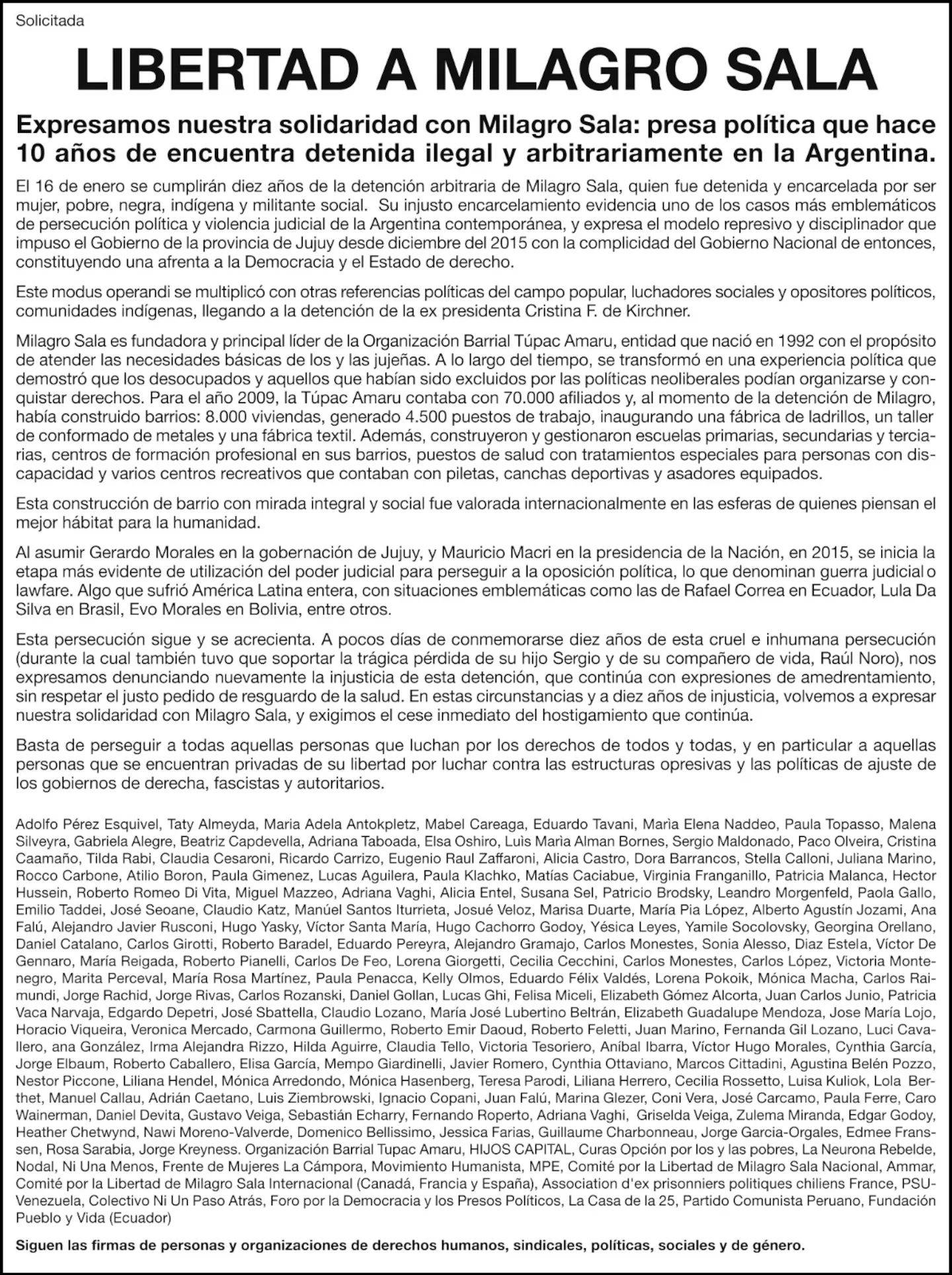 Días atrás, referentes de derechos humanos como Adolfo Pérez Esquivel y Taty Almeida junto a decenas de personalidades publicaron una solicitada en la que denunciaron “el injusto encarcelamiento de Milagro Sala como uno de los casos más emblemáticos de persecución política y violencia judicial”. Y agregaron que “este modus operandi se multiplicó con otras referencias políticas del campo popular, luchadores sociales y opositores políticos, comunidades indígenas, llegando a la detención de la expresidenta Cristina Fernández de Kirchner”.
