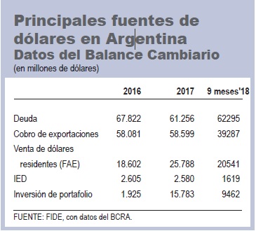 La insistencia del gobierno en el déficit fiscal no puede ocultar que el problema de la Argentina es la insuficiente generación de dólares para enfrentar todas sus necesidades. El cuadro siguiente muestra que desde la asunción de Macrì la principal fuente proveedora es el endeudamiento externo, que supera en forma holgada a las exportaciones. También se observa que la inversión directa extranjera es magra y además declinante, y cuatro veces inferior a la llamada inversión de portafolio, es decir la compra de bonos y acciones con los que se realiza la bicicleta financiera.