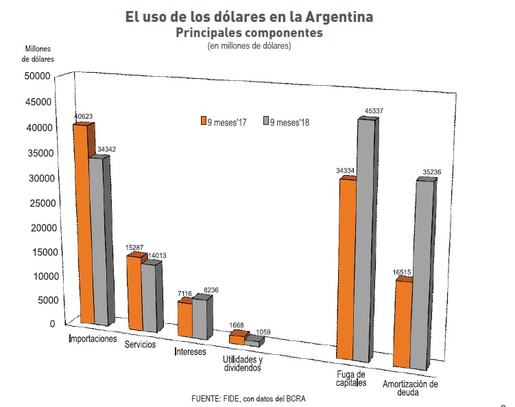 FIDE complementa el panorama con el uso que se dio a los dólares disponibles, en los primeros nueve meses de 2017 y de 2018. El cuadro muestra la importancia creciente de la fuga de capitales y la amortización de deuda, mientras cae la importación de bienes y servicios. La devaluación de los últimos meses cumplió parte de los objetivos del FMI: acentuó la recesión, achicó las importaciones y redujo el desequilibrio de turismo. En cambio, no se produjo el efecto virtuoso que preveía sobre las exportaciones, por la mayor competitividad cambiaria. Se ratificó así que lo decisivo son las condiciones de la demanda en el mercado mundial y no el tipo de cambio. Si el déficit se redujo no fue por el ligero aumento de las exportaciones sino por el verdadero desplome de las importaciones, lo cual dista de ser una buena noticia. Los muertos no pagan, decía Kirchner. Y tampoco compran.