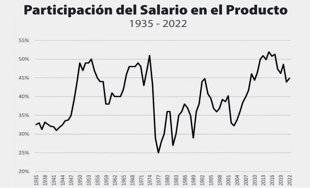 Fíjense los picos de salario, como cayó. El más bajo de todos es el del año 1977, plena dictadura, cae verticalmente y recién volvemos a recuperar la participación por encima del 50% del salario en el producto de la República Argentina durante mi segundo gobierno. Fíjense qué curioso ¿no? Siempre escuchamos que la gente, que los comunicadores mejor dicho dicen “no, el primer gobierno de Néstor fue muy bueno, el primero de Cristina también, pero el segundo…”. En el segundo, en el período de 2011 al 2015, trabajadores y trabajadoras argentinas, ustedes participaban en el Producto Bruto con el salario más del 50%. Por eso dicen que los gobiernos anteriores fueron mejores. ¿Y esto qué significa? ¿Que el gobierno de Néstor o el primero mío…? No, no. Significa que veníamos de una caída monumental después del colapso de la Convertibilidad. Es increíble, hoy escuchamos en la televisión que alguien que presentan como lo nuevo en la política dice que el mejor gobierno que tuvo la República Argentina es el de la Convertibilidad de la década de los ‘90 y que el mejor ministro fue el de la convertibilidad. Pero, la verdad, cuando uno comienza a mirar los números y a ver lo que se dice, realmente tenemos un problema de desinformación muy pero muy grande. Yo creo que hoy el tema de precios, salarios y también inversión y gastos del Estado deben ser abordados desde los números concretos, no desde los eslóganes. Y miren, esto que decimos de la recuperación del salario tiene que ver directamente con que vuelva a pagarse el salario de acuerdo a la productividad también y es algo que tienen que luchar los sindicatos con organización. Por eso, estamos diciendo que también es necesario una suma fija que vuelva a darle capacidad al salario de los trabajadores y que esto no va en detrimento de las paritarias. ¡Por favor! ¿Cómo vamos a ir en detrimento de las paritarias justamente nosotros que fuimos, como lo señaló Abel, los que volvimos a introducir la cuestión paritaria en la cuestión económica?