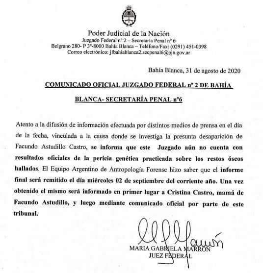 Luego de que el lunes 31 se difundiera una apresurada ‘confirmación’ de que “era Facundo”, la jueza Gabriela Marrón oscuro emitió un comunicado (inusual en ella) para desmentirlo: “El informe final será remitido el miércoles 2”. Pero entre uno y otro de esos días angustiosos, de “dolor en el pecho de madre”, Cristina Castro fue a dormir con otro sacudón inesperado.