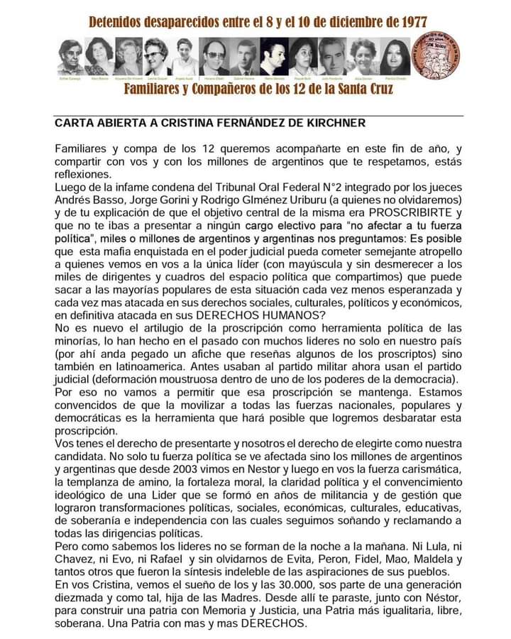 Por todo lo expuesto, seguimos creyendo que la compañera Vicepresidenta Cristina es la única que puede “liderar el proceso que nos permita proyectarnos en la construcción de un modelo de país, nacional, popular, soberano e inclusivo, para los próximos 40 ó 50 años. No podemos regalar nuestra patria, nuestros sueños, nuestros muertos y la lucha de más de dos siglos”.