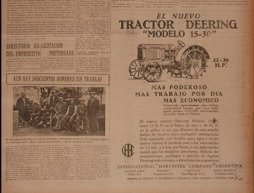 “Más poderoso. Más trabajo por día. Más económico”. La publicidad en la prensa anunciaba la salida a la venta del nuevo modelo de tractor Deering. A su lado, una foto dejaba ver a once húngaros desocupados. Como si fuera un catálogo de productos para arar la tierra, los inmigrantes posaban en una plaza de la capital santafesina. “Aún hay doscientos hombres sin trabajo”, se informaba. Era octubre de 1929 y se iniciaba una larga crisis económica que se venía insinuando desde tiempo antes.