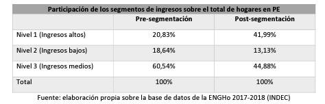 En ese sentido, la segmentación fue redistributiva, porque redujo la participación de los sectores bajo y medio en el conjunto de la población bajo pobreza energética e incrementó la incidencia del nivel de altos ingresos.