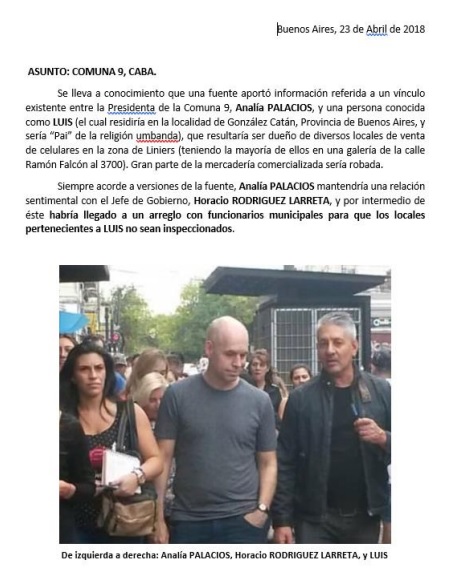 El dictamen también incluye un seguimiento hecho en 2018 y 2019 a Rodríguez Larreta. En ese momento, en base a un informe de inteligencia, los agentes de la Mario Bros mencionan una posible relación sentimental entre el jefe de Gobierno y la presidenta de la Comuna 9 de la Ciudad. El reporte contiene seguimientos callejeros, pedidos de información a conocidos de la mujer y datos de sus redes. Otro tramo permite ver cómo los agentes investigan los vínculos de Larreta con el sindicalista macrista de Comercio, Ramón Muerza, y el empresario Alfredo Coto. “El tema es q Muerza ayudó a Larreta en la campaña...”. “Tenemos q buscar nexos entre Muerza y barras”, dicen. “Y Coto”, dice Alan Ruiz en tres mensajes a sus subordinados.