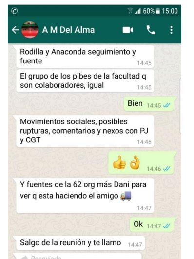 En otro de los prolíficos trabajos de la Súper Mario Bros se incorporan intercambios de WhatsApp del día que Pablo Moyano tuvo un pico de stress y debió ser internado, en agosto de 2018. Los agentes van cotejando a distintas fuentes hasta conseguir datos precisos del estado de salud. Uno de ellos dice que habló con un fotógrafo de un portal de noticias, otro que llamó “al abogado Llermanos” y al jefe de guardia, que responde que va a ir a la clínica de San Justo donde Moyano está internado para a ver si le dan el parte médico.