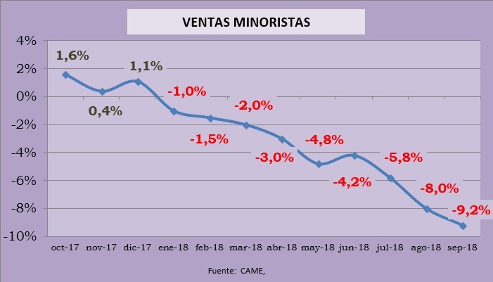 El patentamiento de autos de septiembre mostró una caída del 8,3% (acumulando un 38,5 en lo que va del año), las ventas minoristas un 9,2% mientras que la actividad industrial se desplomó un terrible 11,5%. Y nada hace pensar que las cosas vayan a mejorar, sino todo lo contrario: el derrumbe en todos los casos demuestra estar acelerándose.
