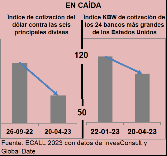El índice del dólar que compara su cotización con el euro, el yen japonés, la libra esterlina, el dólar canadiense, la corona sueca y el franco suizo, cayó 11,4% desde el pico del 22 de septiembre del año pasado hasta el jueves 20 de abril. Lo que era esperable es que si el año pasado la Reserva Federal elevó las tasas de interés ocho veces y ahora la arrimó al 5% para darle un mazazo a la inflación, el dólar suba su cotización y no la baje, como está sucediendo. ¿Qué está diciendo el Dixie (como se conoce al dollar index en la jerga)? Posiblemente la respuesta provenga en gran parte de otro índice, el KBW, que mide la performance bursátil de los 24 mastodontes financieros norteamericanos con cotización bursátil. La crisis bancaria afectó las pequeñas y medianas entidades, pero los inversores temen que termine estropeando a los elefantes. Desde su pico entre el 22 de enero y el 20 de abril, el KBW cayó 26%, y eso que los grandes bancos liquidaron ganancias razonables.