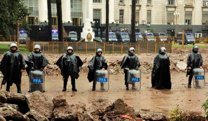 Otra vez los cantos, la música y las banderas. Las calles en caída hacia el Bajo iban trasformándose en embudos humanos desde las cuatro de la tarde. El escenario se había montado en un trailer frente a un edificio desalojado por orden del Ministro de Defensa Oscar Aguad, y protegido con policías que después de varios meses volvieron a aparecer en primer plano. Parados con escudos y celulares en la parte de atrás.