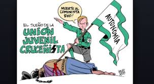 En el pecho del golpista Luis Fernando “Macho” Camacho, a la altura del corazón, hay una cruz potenzada color verde. Es el escudo de la Unión Juvenil Cruceñista, una organización paramilitar de la oligarquía boliviana, racista, separatista y anticomunista, con vínculos que se remontan al franquismo y llegan hasta los grupos neonazis que proliferan en Europa oriental, pasando por el torturador de la Gestapo Klaus Barbie, y que desde hace más de seis décadas opera en Santa Cruz de la Sierra.