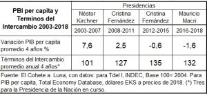 Más allá de las agudas y preocupantes taras de los inversores globales, el hilo conductor que los une al temperamento a soliviantarse de los chacareros contra las retenciones, persistente desde la posición ganada en la disputa de esta cuestión en 2008, con el mito del viento de cola, son los términos del intercambio. Los términos del intercambio se definen como la relación entre el precio de lo que se exporta y el precio de lo que se importa. Teniendo en mente tal definición, hay un punto a aclarar con relación al precio de la tonelada de soja en 2008. Un mes después de aquella noche del 17 de julio de 2008 del no positivo, la posición más cercana del precio de la soja en el mercado de futuros de Chicago tocaba los 602 dólares por tonelada. En diciembre de ese año bajaba a 290 dólares. El año había arrancado con la tonelada a 360 dólares. Entre 2009 y 2010 la tonelada cotizó en promedio a 210 dólares. En 2012 anduvo por los 410 dólares, y en 2014- 2015 en 210 dólares. Actualmente cotiza a 212 dólares la tonelada. En perspectiva, no parecen precios tan deslumbrantes como para hacerlos responsables del buen comportamiento general de la economía. La situación se torna más clara cuando se examina el siguiente cuadro con el conjunto de —y no sólo el de la soja- con relación al producto per capita: