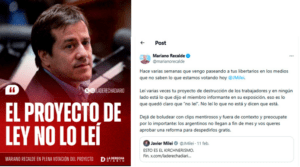 Mientras transcurría el debate del miércoles pasado, La Derecha Diario publicó una foto de Recalde, atribuyéndole haber dicho que no leyó la ley. Ese posteo fue replicado por el Presidente Milei, con el comentario "Esto es el kirchnerismo". Recalde no tardó en responderle al jefe de Estado.