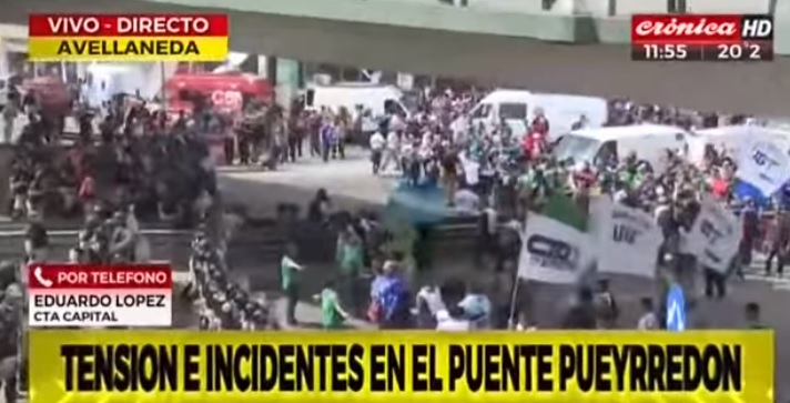 Antes de mediodía las tropas de la Prefectura trataron de impedir la concentración en el Puente Pueyrredón, forcejearon con los manifestantes y les arrojaron gases en la cara. Sin embargo, ante la masividad de la protesta, terminaron por franquearles el paso, rumbo a la Plaza de Mayo.