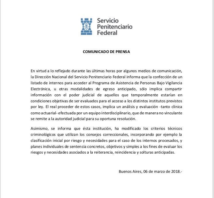 ¿Cuál es la autonomía del SPF? El área depende de Garavano. Sin embargo, cuando se conoció la existencia de esta lista, el ministerio de Justicia le pasó la pelota al SPF. El SPF sacó un comunicado el martes al mediodía donde no aparece ningún otro responsable más que el mismo SPF. En el comunicado, intentaron bajarle el tono a las sugerencias y dijeron que la enumeración de nombres sólo implica acercarle al poder judicial "información" de aquellos que "estarían" en condiciones de ser evaluados para acceder a los beneficios. Y dicen en la última línea del primero de los dos escuetos párrafos que esto no sería "vinculante".