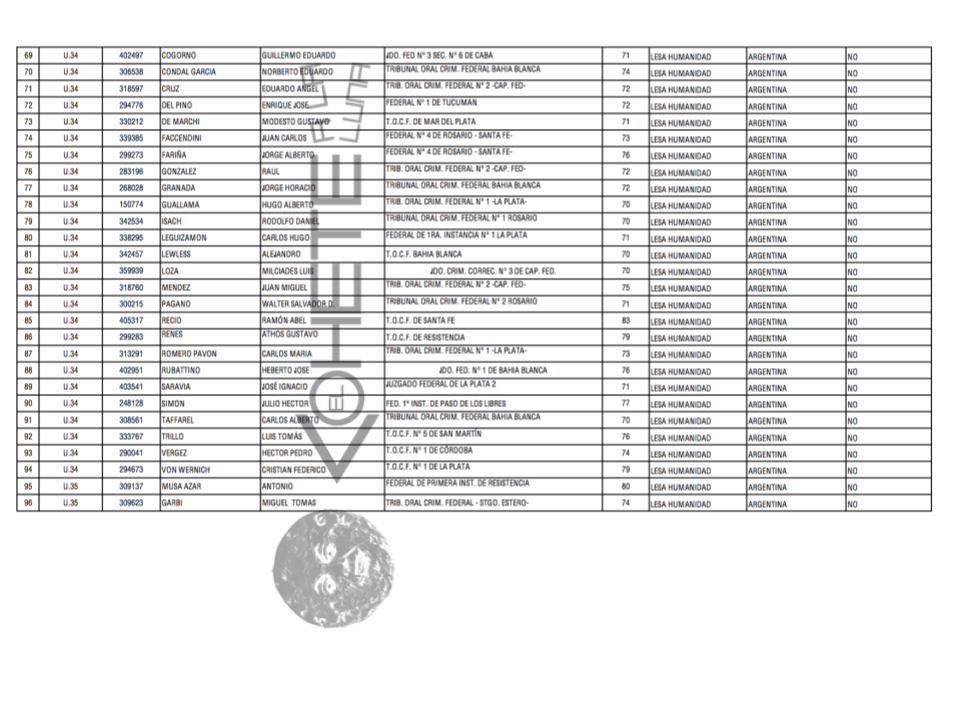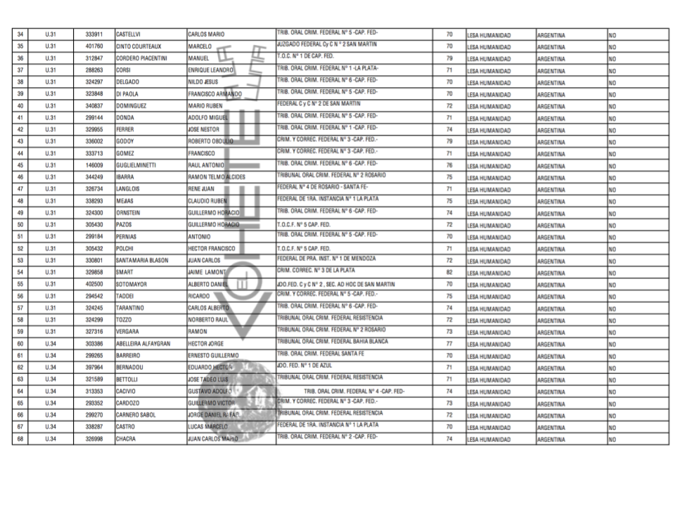 Al mismo tiempo, la Procuraduría de Crímenes contra la Humanidad de la Procuración General de la Nación difundió un informe según el cual no cuenta con elementos que permitan identificar los criterios con los que se realizó la selección del SPF, cuya lista comprende tanto personas condenadas como procesadas.Según el registro de esta Procuraduría, del total de personas condenadas o procesadas por crímenes contra la humanidad que se encuentran detenidas en nuestro país: