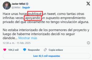 En su segundo tuit, después de la medianoche del sábado, Milei dijo que no estaba interiorizado con el emprendimiento, con el que "obviamente no tengo vinculación alguna". Pero, en sus propias palabras, lo apoyó.