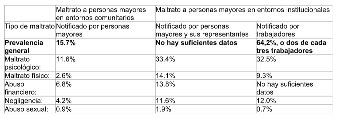 Según un informe de la Organización Mundial de la Salud (OMS) de 2020, basado en un estudio sobre 52 investigaciones realizadas en 28 países de diversas regiones, incluidos 12 países de ingresos bajos y medianos, 1 de cada 6 personas mayores de 60 años (15,7%) sufrieron algún abuso en entornos comunitarios. Esas tasas son más altas en instituciones como residencias de ancianos y centros de atención de larga duración: 2 de cada 3 trabajadores indican haber infligido malos tratos en el último año (64,2%). Probablemente estas cifras sean mayores ya que se calcula que sólo se denuncia uno de cada 24 casos de maltrato. Cuando los controles de las agencias del gobierno y el Poder Judicial fallan o no son eficientes la cifra negra se dispara.
