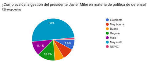 No sorprenden las respuestas a la pregunta anterior, en tanto que por los diálogos que sigo manteniendo con algunos militares, aquellos que se consideran liberales aprecian fuertemente las acciones simbólicas y las recientes compras del F-16 y del Stryker; pese a que la información presupuestaria muestra una caída en el presupuesto de la función defensa y en el destinado al adiestramiento y a las operaciones, y al desastre que la gestión de Petri & Presti ha realizado en IOSFA, que ha dejado a muchos integrantes de las Fuerzas Armadas y de las Fuerzas de Seguridad, y sus familiares, sin cobertura en todo el país.