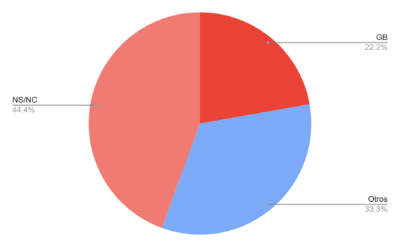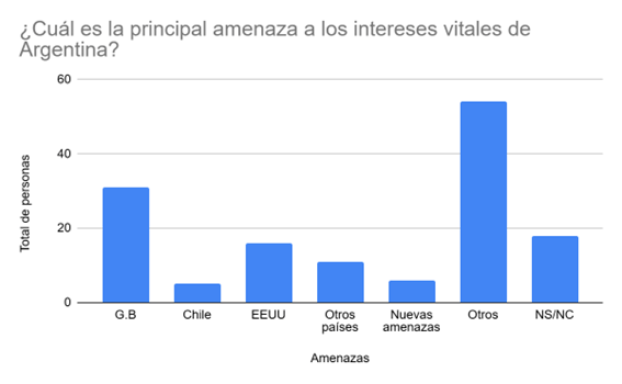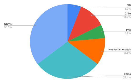 Los resultados muestran que solamente el 15,61% de los participantes identificaron al Reino Unido de Gran Bretaña e Irlanda del Norte como una amenaza. El resto de las respuestas se repartió entre NS/NC en un 34,57% y en las ya viejas conocidas, pero siempre vigentes, nuevas amenazas (narcotráfico, terrorismo, crimen organizado, narcoterrorismo, pesca ilegal), en un 25,65%. Mientras que en la categoría “otros” agrupamos respuestas, tales como ideología de género, calentamiento global, corrupción política, recursos naturales, entre otras.