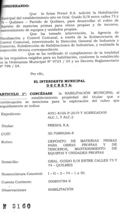 José Rossi está casado (según acta notarial BAA03862921 a la que accedió El Cohete) con Rosa Olinda Caracciolo, quien como titular de Presol tramitara la habilitación del predio para depósito. El abogado de esa empresa era Chiodo padre, uno de cuyos hijos le firmó el decreto, como se documenta aquí:
