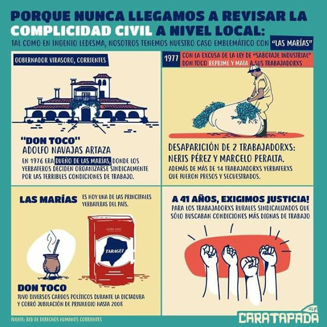 A principios de julio comenzará finalmente el Juicio a Las Marías, empresa yerbatera dueña de Taragüí, Unión, La Merced y La Mañanita, por delitos de lesa humanidad cometidos contra trabajadores y sindicalistas durante el terrorismo de Estado. El juicio se desarrollará, a pedido de las víctimas, en la propia ciudad de Virasoro, al noreste de Corrientes, donde la empresa tiene sus establecimientos productivos.