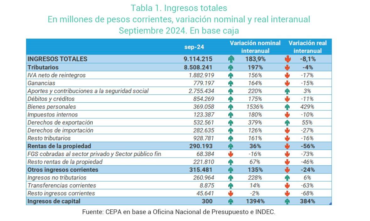 Como se observa en los datos de recaudación de septiembre, publicados en la última semana, Bienes Personales mostró un extraordinario crecimiento en la recaudación (+429%). Esto se produce porque en septiembre venció la presentación y pago del saldo de la declaración jurada de personas humanas del período fiscal 2023 (el año pasado ese vencimiento fue en junio) y al mismo tiempo se recaudaron $ 881.133 millones vinculados al Régimen Especial de Ingreso del Impuesto sobre los Bienes Personales, que permite adelantar cinco años del impuesto, garantizando estabilidad fiscal a quienes ingresen pero afectando los ingresos futuros del Estado. Esto implica que el crecimiento en los ingresos por Bienes Personales en septiembre fue puntual y por única vez, e incluso va en detrimento de ingresos futuros por este gravamen.