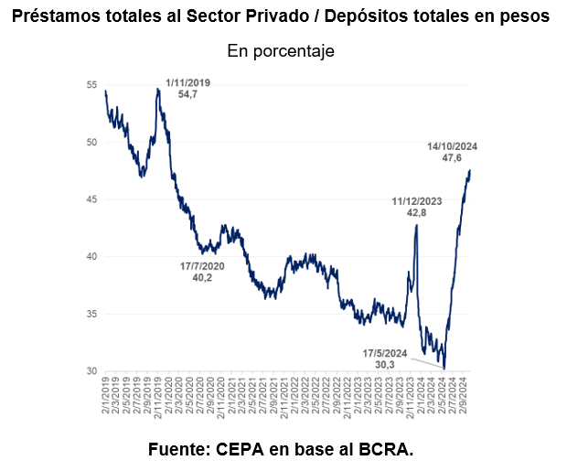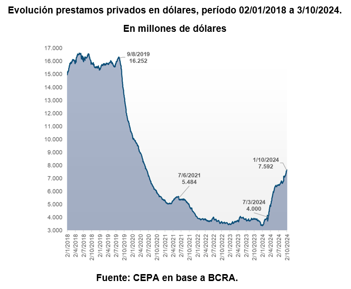 Los dólares ingresados al blanqueo pasan a integrar, va de suyo, las reservas brutas en la medida en que se constituyen en depósitos en dólares, pero no integran las reservas netas, dado que se descuentan como encajes de los depósitos en dólares. Ahora bien, ¿cómo podría lograr el BCRA que aumenten las reservas netas a través del blanqueo? Para ello los bancos deben aumentar la cantidad de préstamos en dólares, y al introducir esos depósitos en el mercado abren la puerta al BCRA como potencial comprador de los mismos. Los préstamos en dólares tocaron un mínimo histórico a comienzos del 2024 (USD 3.000 millones) pero hacia finales de septiembre superaron los USD 7.500 millones. Esto tiene una característica muy evidente: en el corto plazo es un dato positivo, pero en el mediano plazo la devolución de estos préstamos en dólares (para lo cual habrá deudores yendo a comprar dólares) supondrá una caída equivalente en reservas netas. Es un esquema que tendrá una reversión. Así y todo, podría constituir un puente claro para que el gobierno lo use en su favor con el objetivo de levantar el cepo. En efecto, en la última semana, el BCRA anunció la reducción del plazo de pago de importaciones de 60 a 30 días (comunicación A 8118).