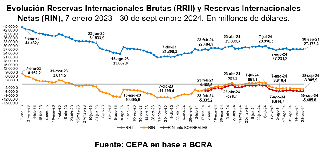 Las dificultades para acumular reservas son el talón de Aquiles del modelo macro que, en teoría, venía a resolver todos los problemas con superávit fiscal. El último dato, al 30 de septiembre, arroja USD -5.485 millones de Reservas Netas de BCRA, considerando el descuento por pago de Bopreales a vencer en los próximos 12 meses.