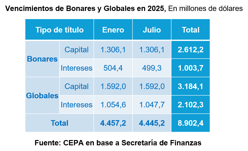Sobre este escenario complejo es que se montan los vencimientos de deuda. Sólo en 2025, hay vencimientos de Bonares y Globales por USD 5.796 millones en capital y USD 3.106 millones en intereses. Esta es la verdadera razón que explica el apuro del gobierno, a través de la Secretaria de Finanzas, para publicar el DNU 846 que le permite impulsar canjes de esta deuda sin pasar por el Congreso. No obstante, aplica para bonos bajo la ley local, aunque dentro del proyecto de la Ley de Presupuesto 2025 (en el artículo 54) se habilita la oferta de canjes tanto bajo ley local como extranjera.