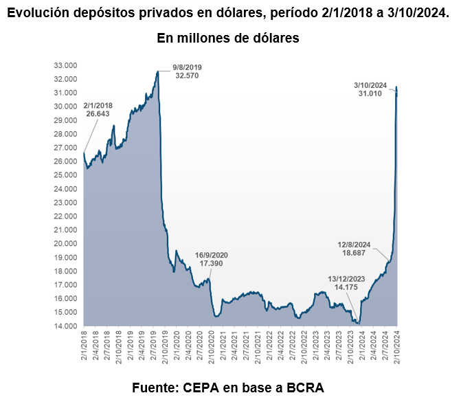 La llegada del blanqueo implicó que los depósitos en dólares crecieran significativamente, registrando un aumento de USD 12.678 millones entre el 15/8 y el 30/9. Solo en la última semana de septiembre, el ingreso de USD fue de 6.266 millones. Desde el 1 de octubre la acumulación de depósitos en dólares empezó a reducirse. En los primeros diez días se redujeron en casi USD 1.000 millones (el saldo neto de ingresos adicionales y salidas).