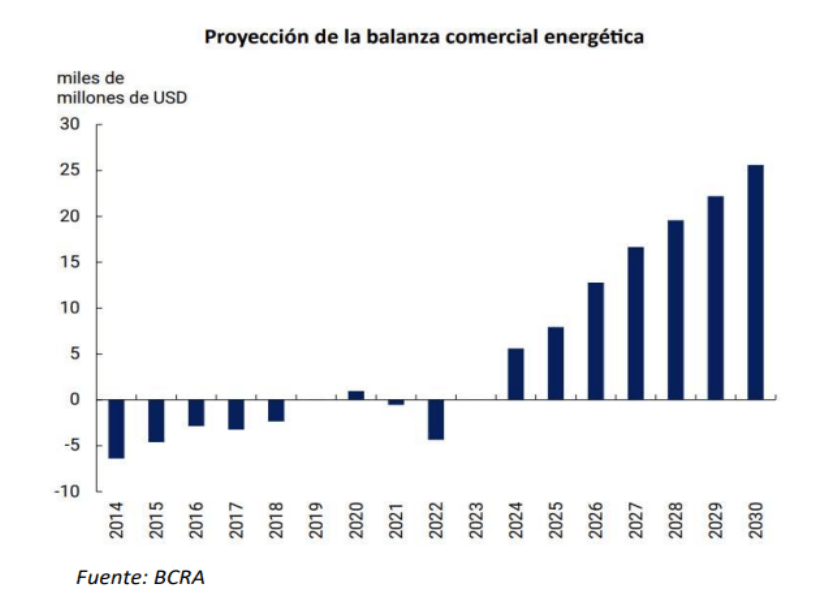 El obstáculo para levantar los controles cambiarios no sólo es de stock, como se mencionó antes (reservas versus pasivos), sino de flujo: el día después del fin del cepo, ¿cuál es el sostén de la balanza de pagos (asumiendo un tipo de cambio apreciado)? Con Macri la salida fue la toma de deuda, pero precisamente por las consecuencias de esa experiencia, en 2024 la Argentina ya no cuenta con esa vía de financiamiento neto. Las perspectivas de la balanza comercial energética, sin embargo, parecen arrojar un panorama positivo. Según estimaciones del BCRA, como grafica la consultora Research 1816 en el siguiente gráfico, desde 2026 en adelante ese sector aportaría USD 10.000 millones extra. En definitiva, de haber holgura en el frente externo (y aun perdiendo el gobierno de Milei la mejor inversión: la planta de GNL por Petronas), tiene bases claras en las decisiones tomadas en el pasado a partir de la inversión en Vaca Muerta de la estatal YPF.