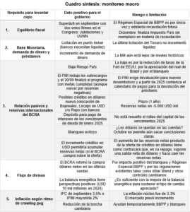 - Inflación alineada con el ritmo de crawling peg (requisito agregado recientemente por Milei)