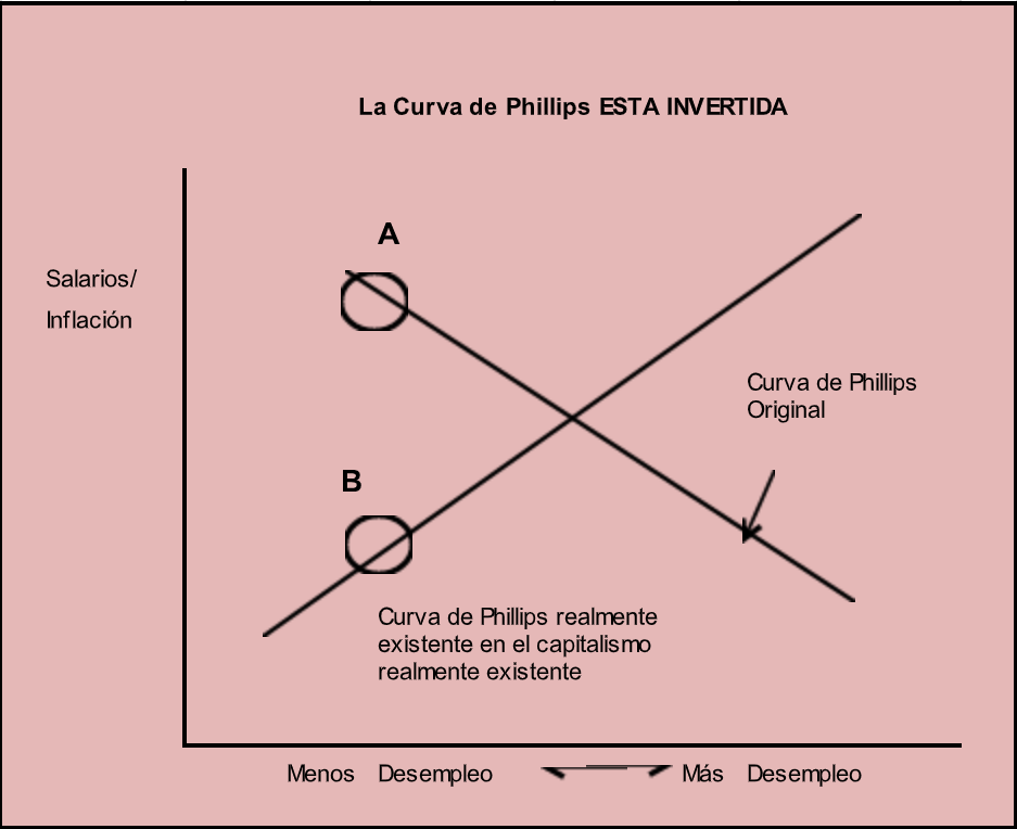 En las economías capitalistas modernas, esta rigidez relativa del consumo es uno de los antídotos más poderosos contra el proceso de reacción en cadena que, de otra forma, llevaría derecho a una crisis de mayor magnitud. Hoy en día, una gran parte de una producción adicional eventual puede ser operada sin creación proporcional de un nuevo poder de compra. La relación de Phillips está invertida (B). Lejos de acrecentar la inflación, el avance del empleo compensa el excedente de demanda, y lejos de reducir los beneficios monetarios, el desempleo tiende más bien a aumentarlos, debido a que la oferta de mercaderías está reducida de la totalidad del valor agregado no producido, mientras que la demanda no es reducida más que de la diferencia entre salarios y asignaciones por desempleo.