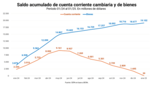 Lo que publicamos en ediciones anteriores de El Cohete a la Luna muestra las dificultades derivadas de un doble proceso: 1) el deterioro de la balanza comercial y 2) el resto de conceptos de la cuenta corriente de la balanza de pagos, donde tienen protagonismo la demanda de dólares por turismo y viajes y el pago de servicios de deuda. Desde mayo de 2024, la balanza comercial se modera sensiblemente en su superávit (en enero y febrero de 2025 mantiene un muy leve saldo positivo) a la par que tiene lugar un sostenido deterioro de la cuenta corriente.