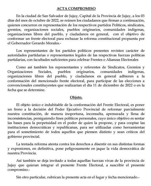 Pero el 3 de octubre, los sectores del campo nacional y popular de Jujuy crearon el Frente Electoral ¡No a la Reforma!, integrado por 18 partidos opositores, excepto el PJ, con una única finalidad: evitar la modificación de la Constitución provincial por considerarla “inoportuna, inconsulta, apresurada y llena de inconsistencias”.