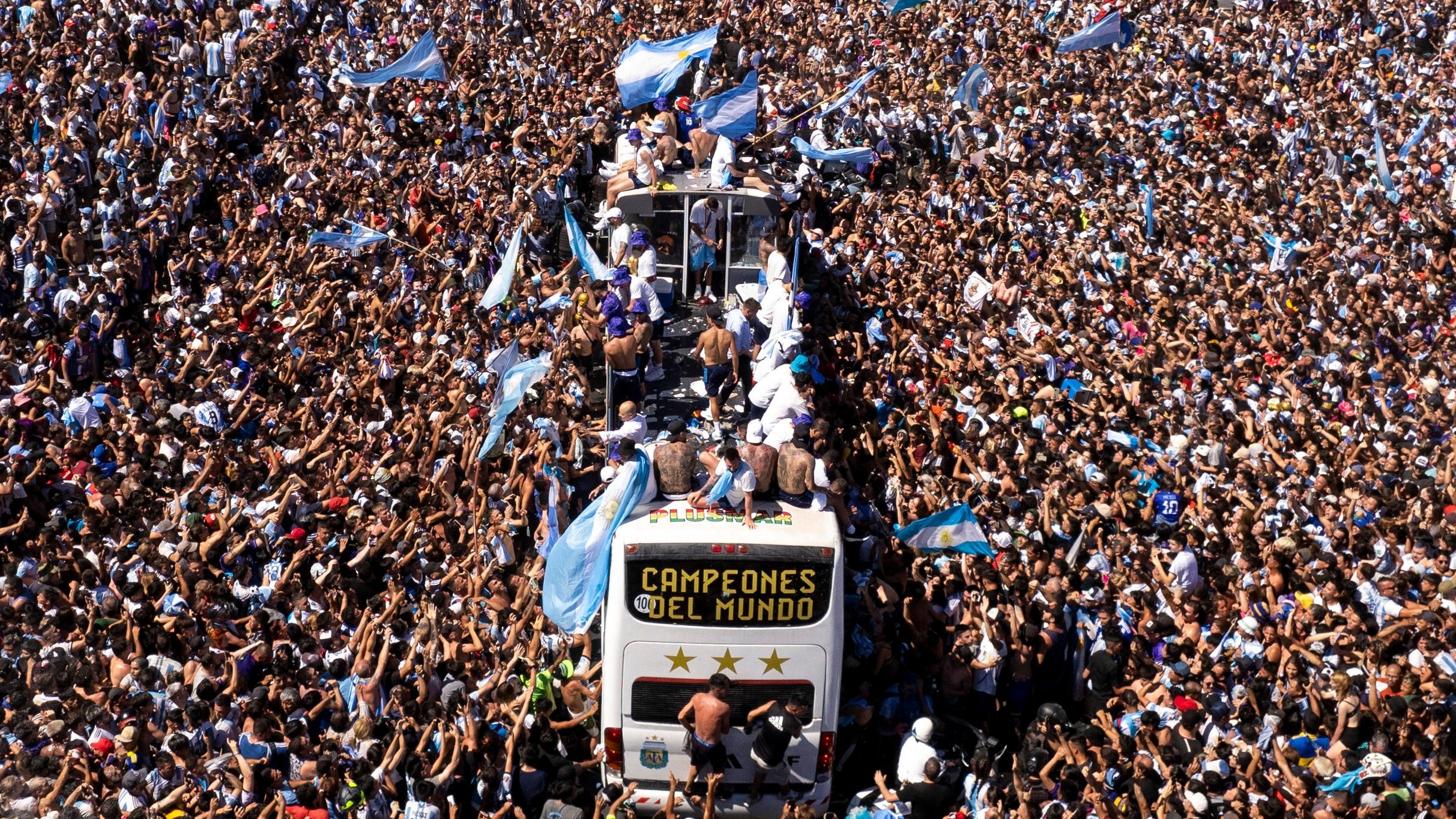 La caravana quedó trunca, por culpa del mal manejo de las autoridades de seguridad. Pero de todos modos produjo imágenes inolvidables. Arriba del ómnibus, los futbolistas celebraban como la gente que estaba abajo, en las calles, saludando al vehículo a su paso: cantando a los gritos, en cueros, sacándose selfies, bebiendo de botellas plásticas cortadas al medio y asándose al sol. Lejos de allí, muchedumbres circulaban como hormigas por avenidas y autopistas, fluyendo a la velocidad de la sangre. Un drone que planeaba sobre la Avenida 9 de Julio registró la marea humana, que desde las alturas parecía un infinito guiso de lentejas; superó los postes de luz, todos los cuales tenían personas encaramadas a sus topes, después de haberlos trepado cual palo enjabonado; sobrevoló una imagen enorme del Dios Diego y después se elevó hasta revelar a la gente que había coronado la cima del Obelisco, a 60 metros de altura. (Una escena más espectacular que las producidas por Peter Jackson y un batallón de nerds para El señor de los anillos — sólo que, en este caso, la imagen no había sido creada digitalmente, sino que reproducía algo real.)