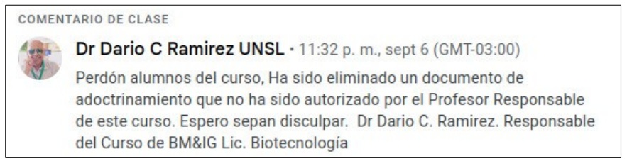 Sin embargo, el 6 de septiembre Ramírez decidió eliminar de la sala virtual de clases los contenidos vinculados con el BNDG. Al hacerlo, dejó un mensaje a las y los estudiantes, que pese a sus edades y formación no estarían en condiciones de distinguir por sí mismos lo que su profesor llama “adoctrinamiento”.