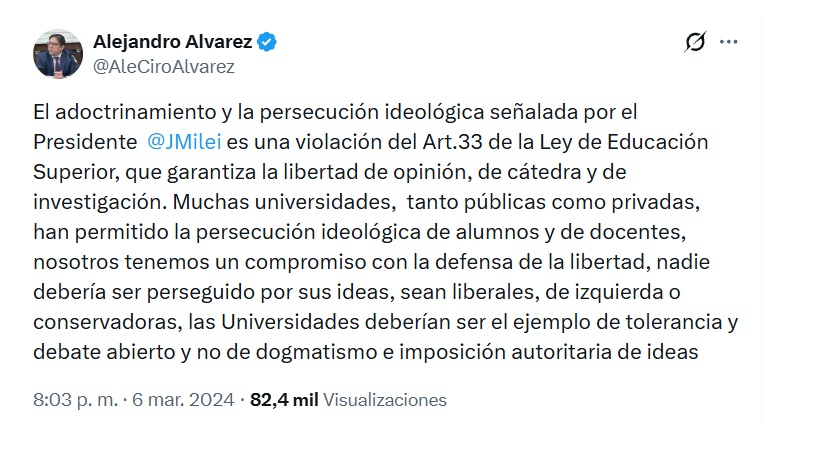 Según lo relatado por Seguín al Cohete, tras la eliminación de los archivos ambos docentes mantuvieron una reunión y acordaron que Ramírez volvería a cargarlos, aunque expresando su desacuerdo. El titular de la cátedra no cumplió lo pactado y, cuando Seguín se lo reclamó, avisó que no lo haría y plantearía el tema a la Subsecretaría de Políticas Universitarias. Su titular, Alejandro Álvarez hijo, es el principal difusor del concepto de “adoctrinamiento” para descalificar ideas o conocimientos con los que no comulga. La posición que tome frente al caso puntano permitirá entrever los contornos de la libertad que proclama, y si vale para todos o sólo para propios.
