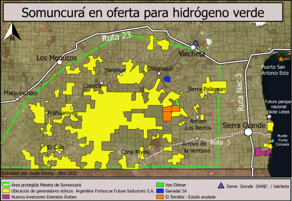 Todas las tierras públicas provinciales sin mensurar de la meseta de Somuncurá son las que Argentina Fortescue Future Industries S.A. (FFI) eligió para ubicar los molinos de generación eólica para el proyecto de hidrógeno verde, iniciativa privada declarada de interés público el mes pasado. La firma, con casa matriz en Australia, presentó un mapa con el despliegue proyectado en el Área Natural Protegida Meseta de Somuncurá. Ese bloque, de aproximadamente 625.000 hectáreas, es el que se ofrecerá en licitación pública en forma inminente a partir de una decisión del Ejecutivo local, respaldada sin oposición en la Legislatura. Comprende la totalidad de la tierra fiscal sin mensurar, de acuerdo al análisis cartográfico realizado por Javier Grosso para este informe.