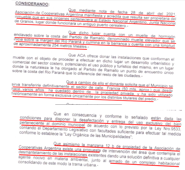 La Asociación de Cooperativas Argentinas (ACA) realizó una donación de un muelle de hormigón enclavado sobre la costa del partido de Ramallo. A cambio, solicitó que el municipio le transfiera definitivamente unos 50 metros de la calle Francia, que desde hace años quedaron adentro de su propiedad. ACA desmantelará sus instalaciones y realizará allí un complejo habitacional. El Concejo Deliberante –que recibió la propuesta por parte del intendente Gustavo Perié– la aprobó el 5 de agosto, por mayoría de los concejales de Juntos por el Cambio. Le cedieron así parte de una calle que, de haber sido defendida, hubiese significado otro acceso público más hacia la costa. A su vez, le permitieron desarrollar un majestuoso negocio inmobiliario, afectando el uso del suelo en una zona no apta para la ampliación urbana, sin contar con informes de organismos pertinentes y sin un estudio de impacto ambiental. Sin un Código de Ordenamiento Urbano y Territorial (COUT) discutido con la sociedad, lo que impera en el gobierno de Perié son ordenanzas modificatorias del uso del suelo en beneficio de unos pocos.